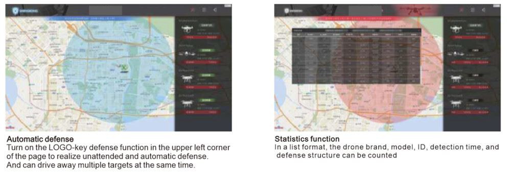 Tunkeutuville drooneille voit valita: Yhden näppäimen automaattinen puolustus: Kun järjestelmän puolustustoiminto on aktivoitu, järjestelmä puolustaa tunkeutumislennokkia automaattisesti ilman henkilökuntaa; Manuaalinen interventio: Voit manuaalisesti puolustaa mitä tahansa dronea ja miten time defense tai keskeyttää puolustus, ja voit valita lentäjän paikantamisen.